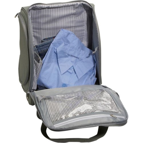 44008-43 Color: Sage Features: -Material: Crinkle nylon. -15" Wheels down the airplane aisle. -Fits underneath the seat. -Large main compartment and separate front organizer compartment. -Retractable handle with 2 height positions: 30.25" and 40.25". -Dimensions: 16" H x 13.5" W x 10" D.