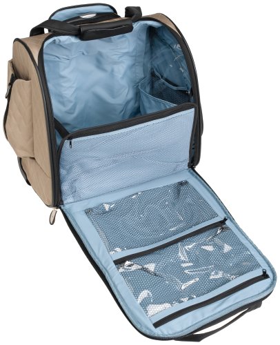 6454-7 Color: Khaki Features: -Quilted microfiber.-Large main compartment with three interior pockets for organization.-Two zippered PVC mesh pockets on inside front panel.-View Thru panel zips open for easy viewing of case contents and is packable for organization.-Cooler compartment keeps snacks and beverages fresh.-Front organizer compartment and zippered front pocket.-Full-size back-up bag folds away. Dimensions: -Dimensions: 13.5'' H x 13.5'' W x 8'' D.