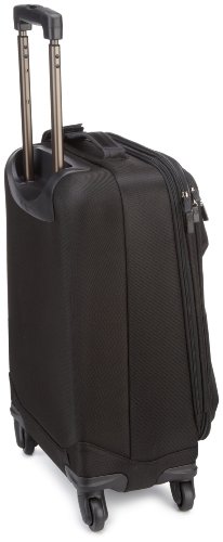This expandable wheeled carry on delivers the best of both worlds by combining 360 degree manuverability with the ability to handle tough terrain. the four-wheel castor system creates zero weight-in-hand when rolling upright and provides stable control through tight spaces. the bag also offers the maximum amount of interior packing space. the top, side and bottom haul handles compress flat against the bag for compact storage in luggage compartments. the spacious front pocket can house up to a 17" laptop. a 2" zipppered expansion creates 17% more capacity on demand. interior compression straps and a tri-fold suiter reduce wrinkling and keep clothes secure. removable attach-a-bag strap secures a additional bag to the front of the upright for consolidated travel. removable id tag for security and convienience. comprised of a 1500d tedeolen fabric which provides resistance to moisture and abrasion. travel sentry approved key lock included. backed by a lifetime warranty and is guaranteed to be free from manufacturing defects in materials and workmanship for the life of the product.