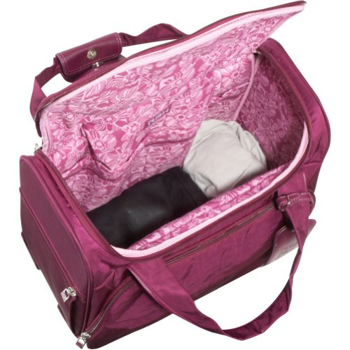 This carry-on easily fits under the seat, is very maneuverable and roomy! And it's light and available in a pretty color.