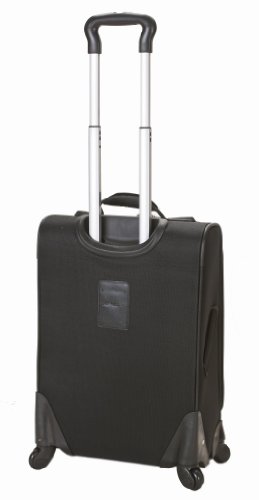 This carry on is made of 1200 denier polyester. Four multi directional spinner wheels rotate 360 degrees for easy maneuverability. This luggage allows you to pack more while avoiding the excess weight surcharges imposed by most airlines. Features: multi-directional spinner wheels for easy maneuverability, modern internal aluminum telescoping handle with push button handle, and interior mesh and zip pocket and elastic pocket. Measures 20 inches long x 14 inches wide x 9 inches length and weighs 9 pounds. 3 year limited warranty.