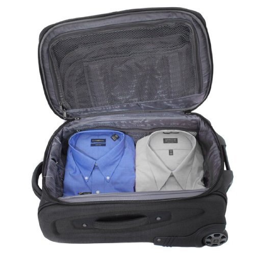 - Large fully lined interior features garment restraints, one quart size flight friendly toiletry top zip bag for carry-on liquid, a full length mesh zipper pocket, and a full length zipper pockets